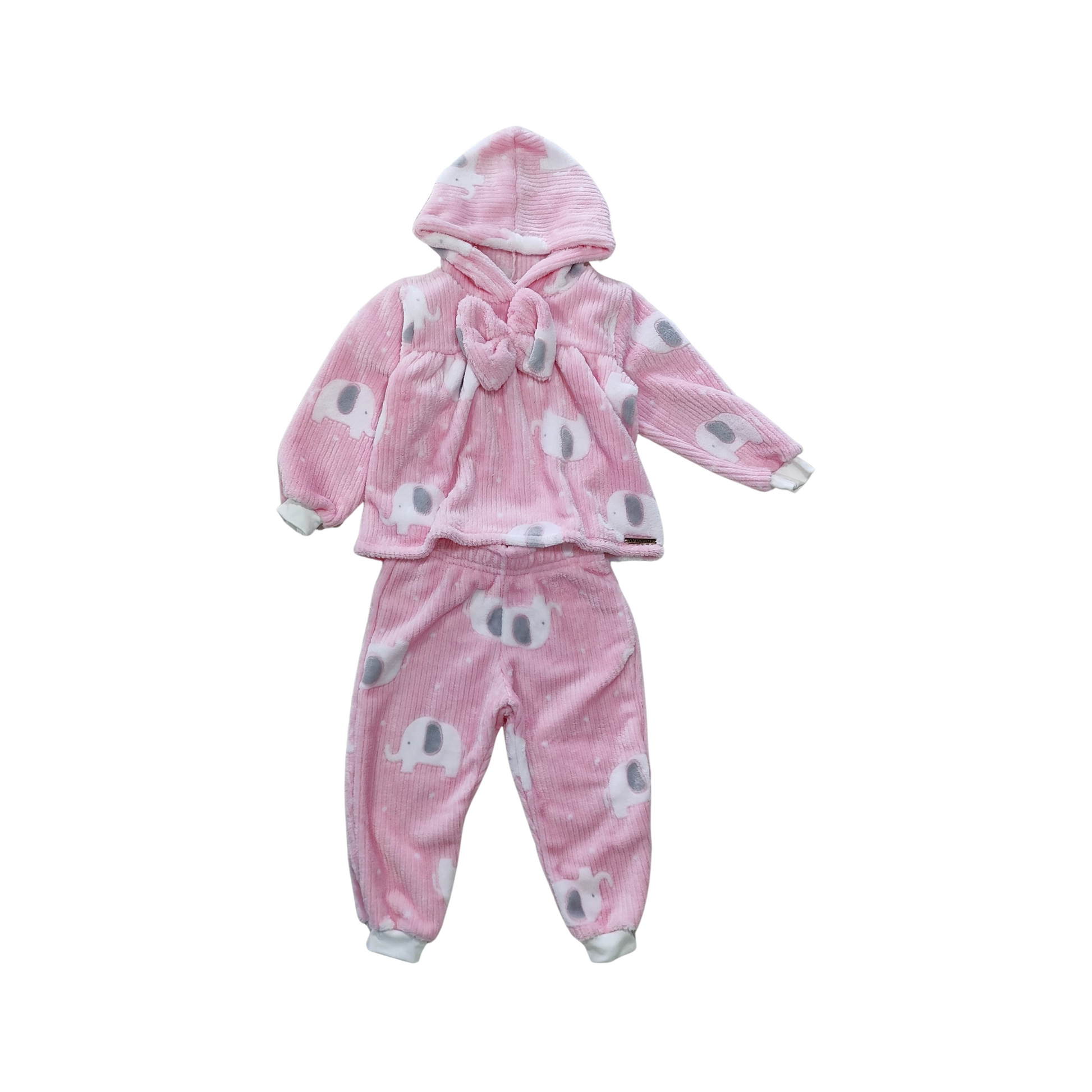 La blusita de manga larga viene con una capucha acogedora y un lazo frontal del mismo tejido, agregando un toque de dulzura y encanto. El pantaloncito a juego completa el look con comodidad y libertad para moverse, jugar y soñar.