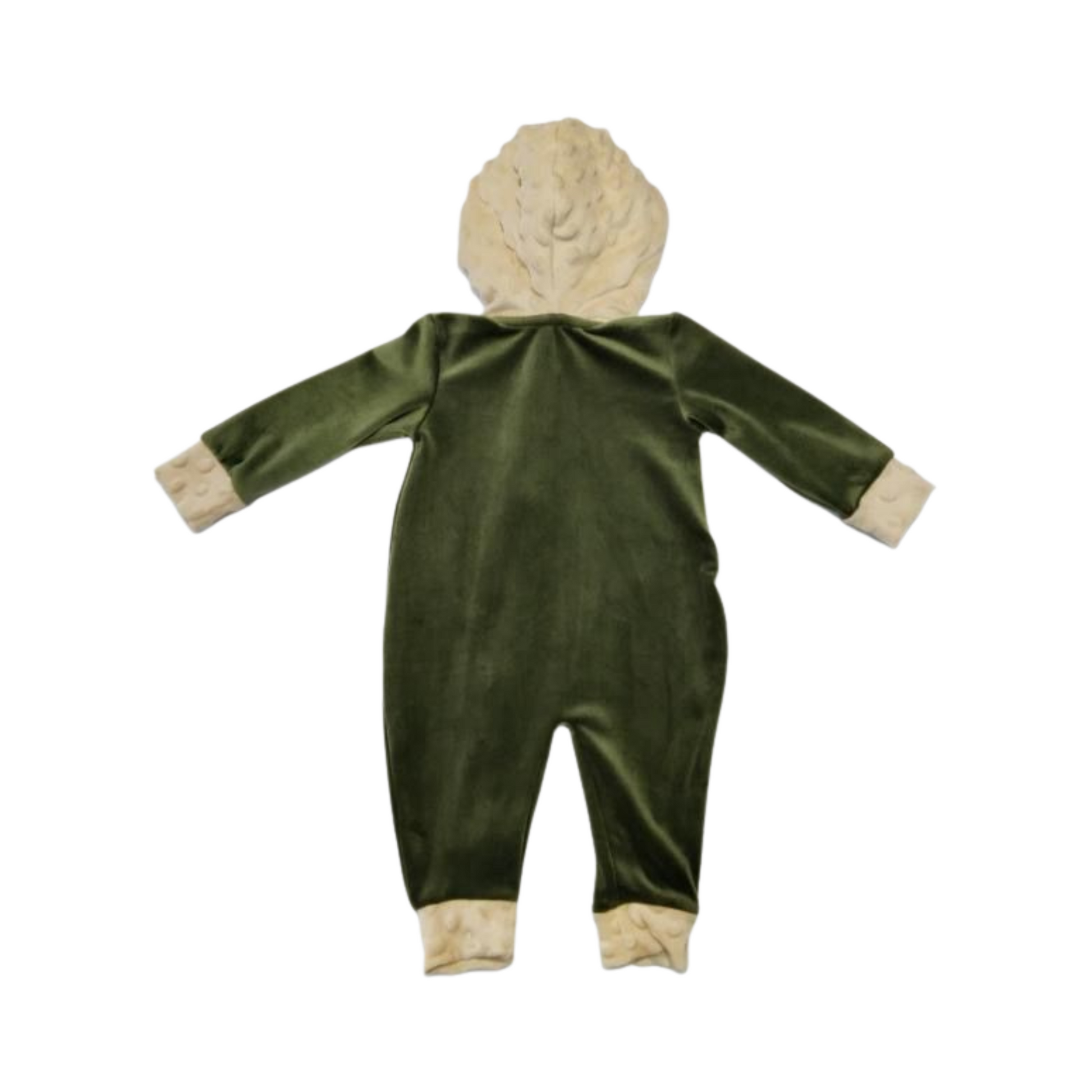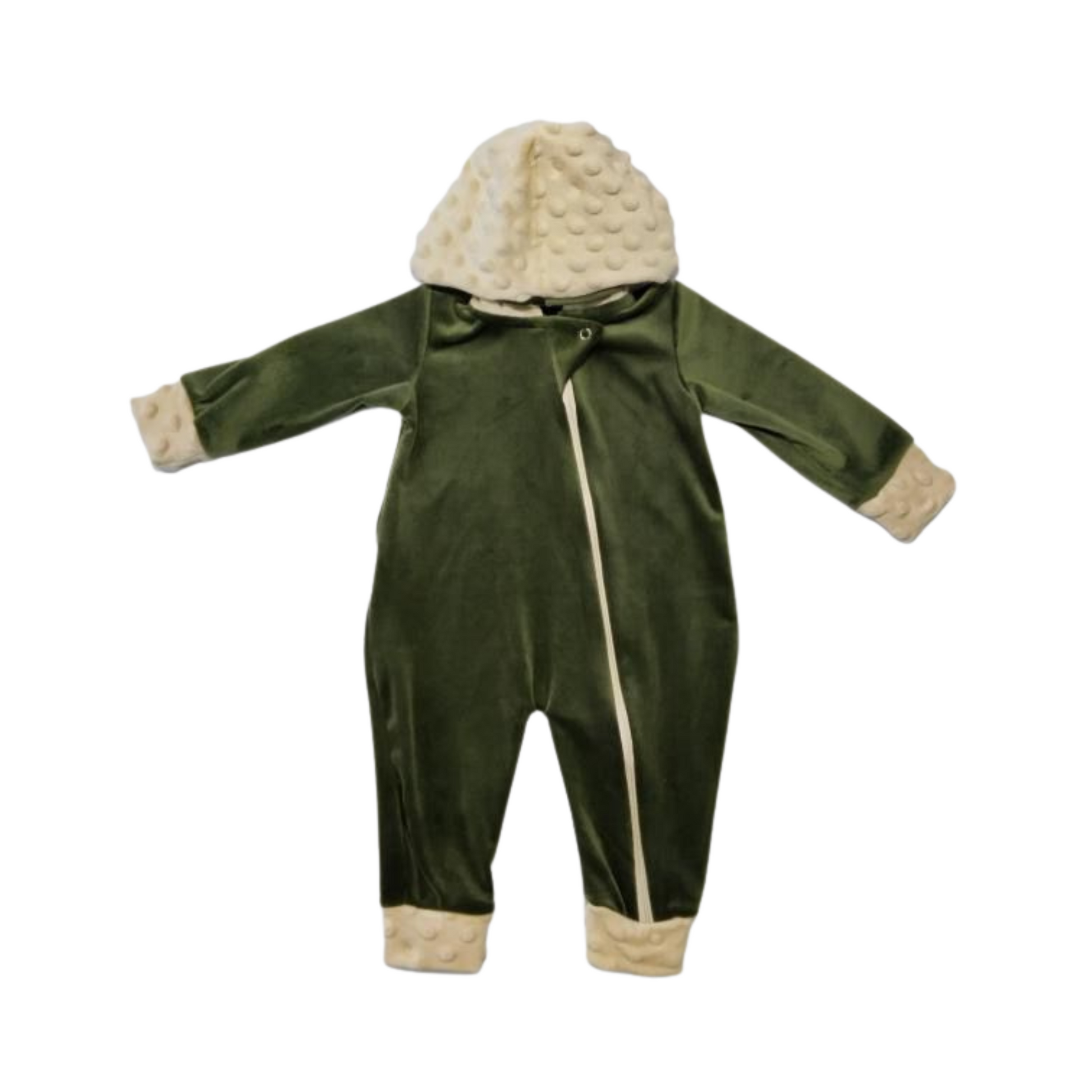 Este hermoso enterito está confeccionado en plush verde 100% poliéster, hipoalergénico y extra suave, ideal para los días fríos. Su diseño cómodo y funcional incluye cierre frontal con cremallera color crudo, con protección en la parte superior para evitar roces en el cuello del bebé.